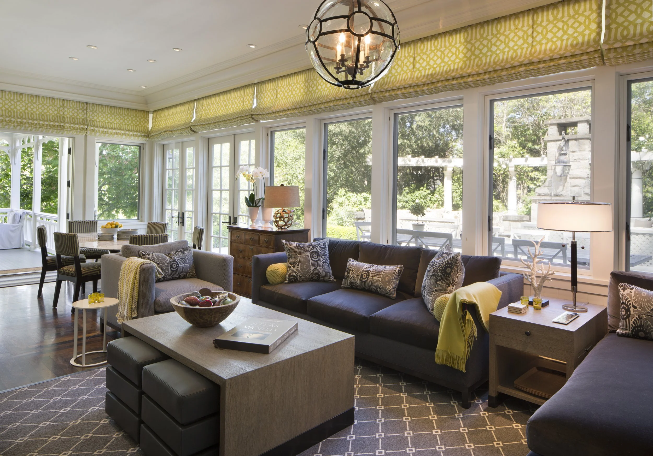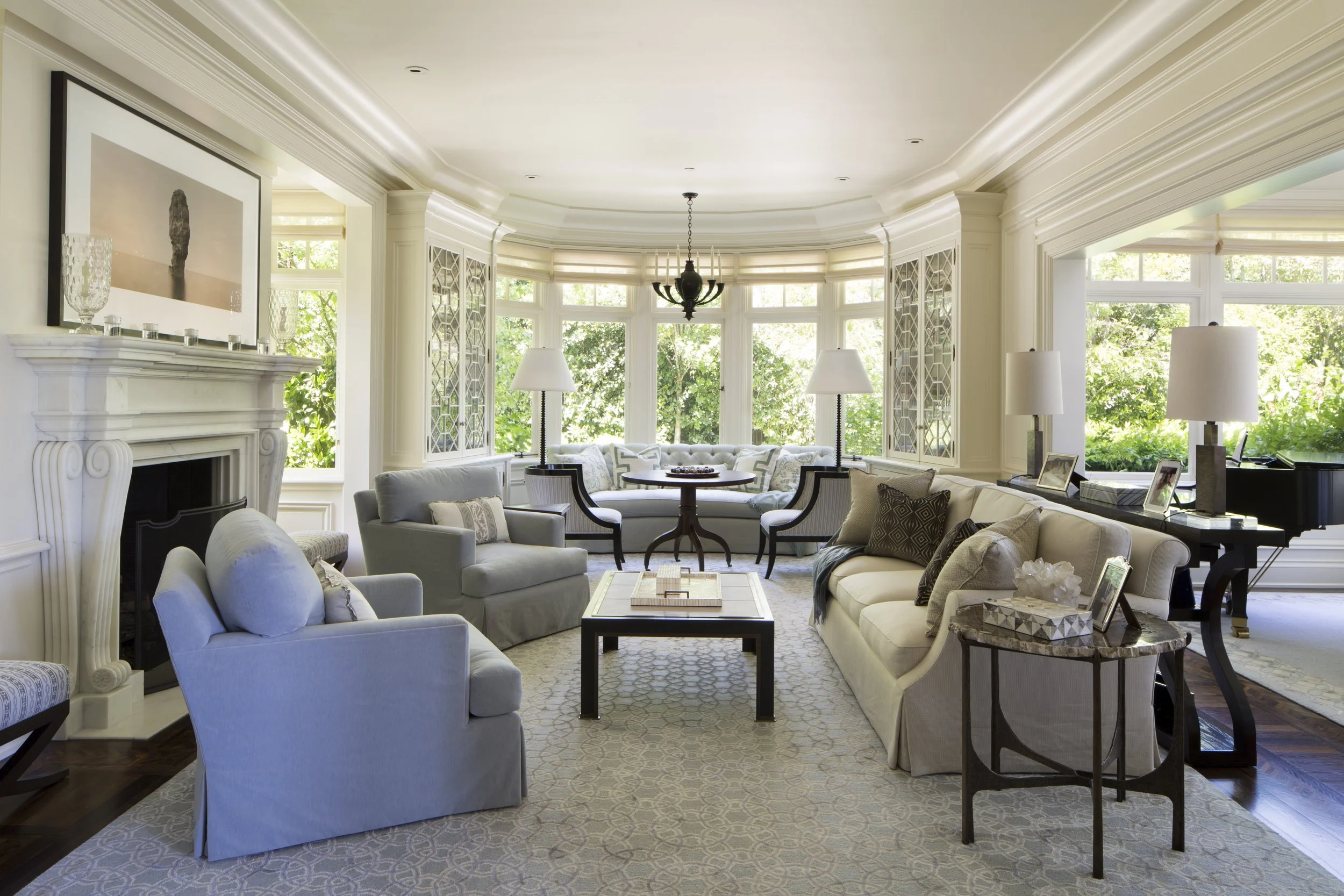Throughout the interiors, a restrained palette of soft neutrals, layered textures, and tailored furnishings creates a sense of continuity from room to room. Formal spaces feel intimate rather than imposing: a richly paneled dining room glows under the warmth of crystal chandelier light, while the living room’s curved bay window draws the surrounding greenery inward, blurring the boundary between indoors and out.