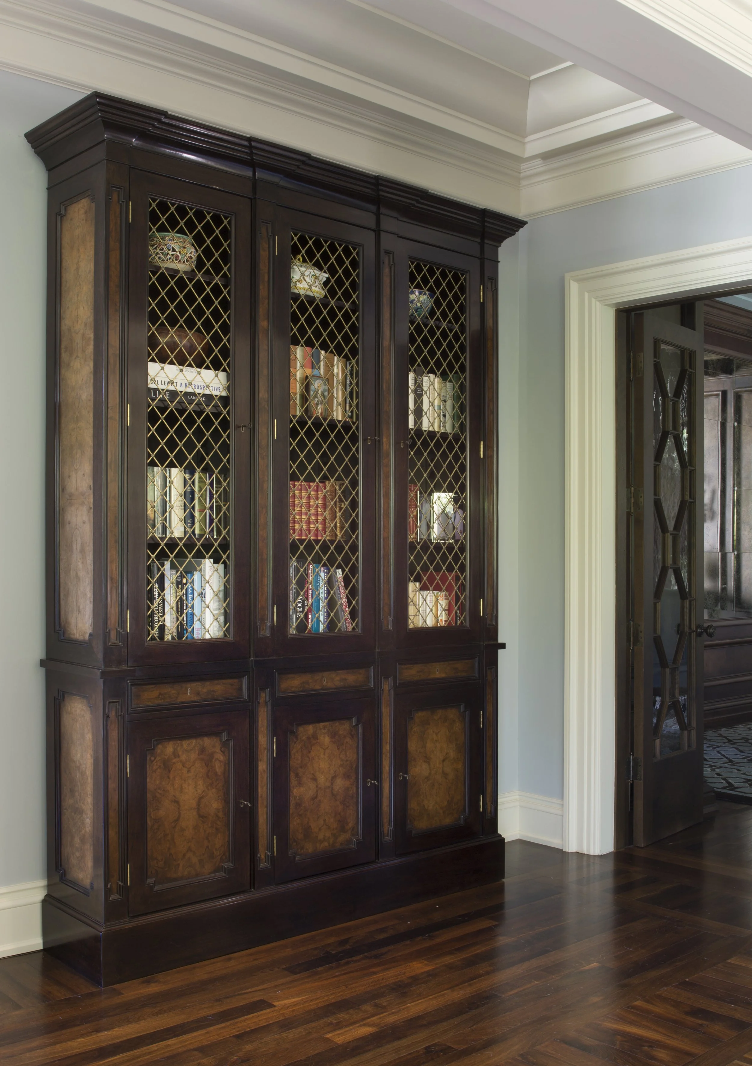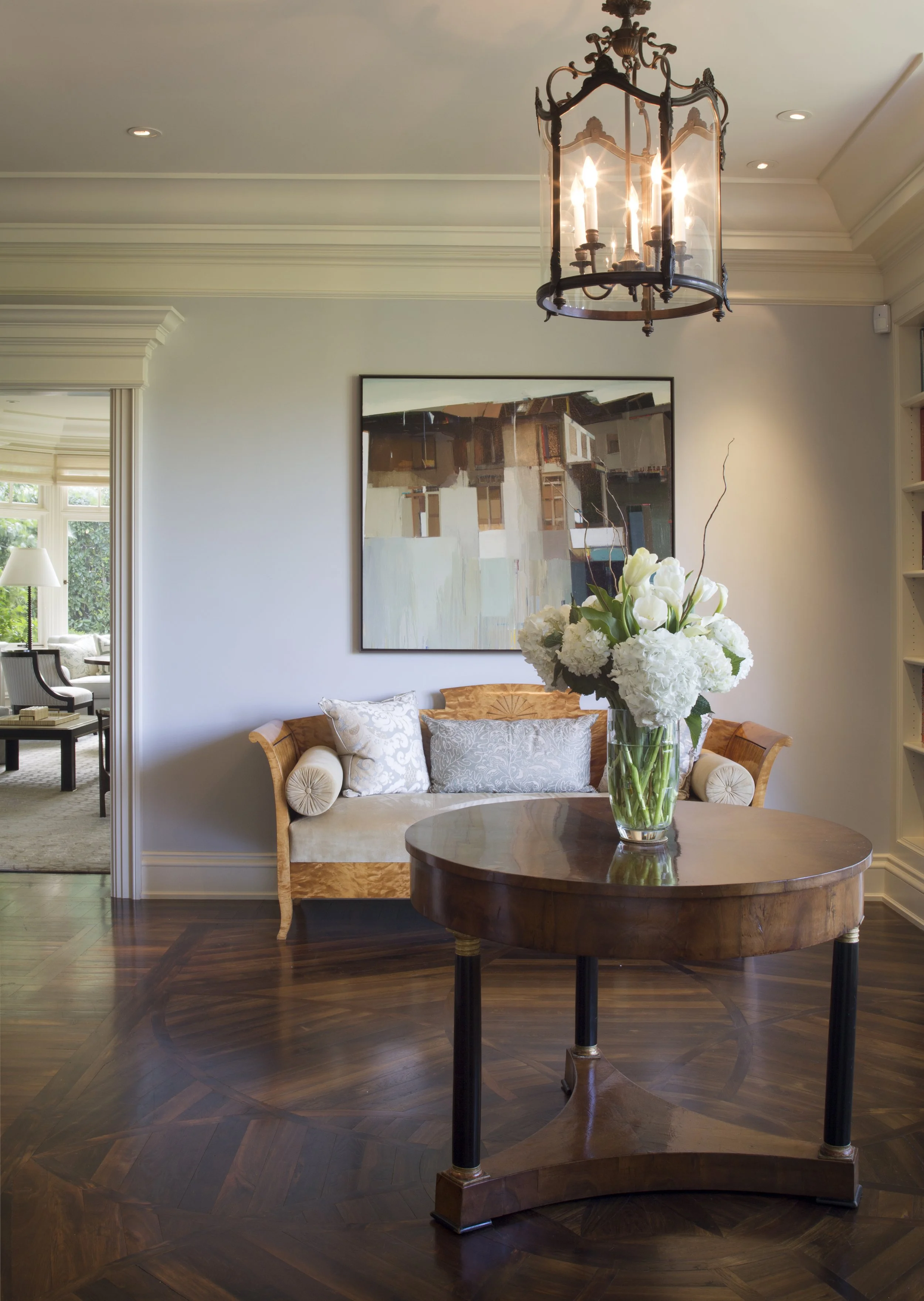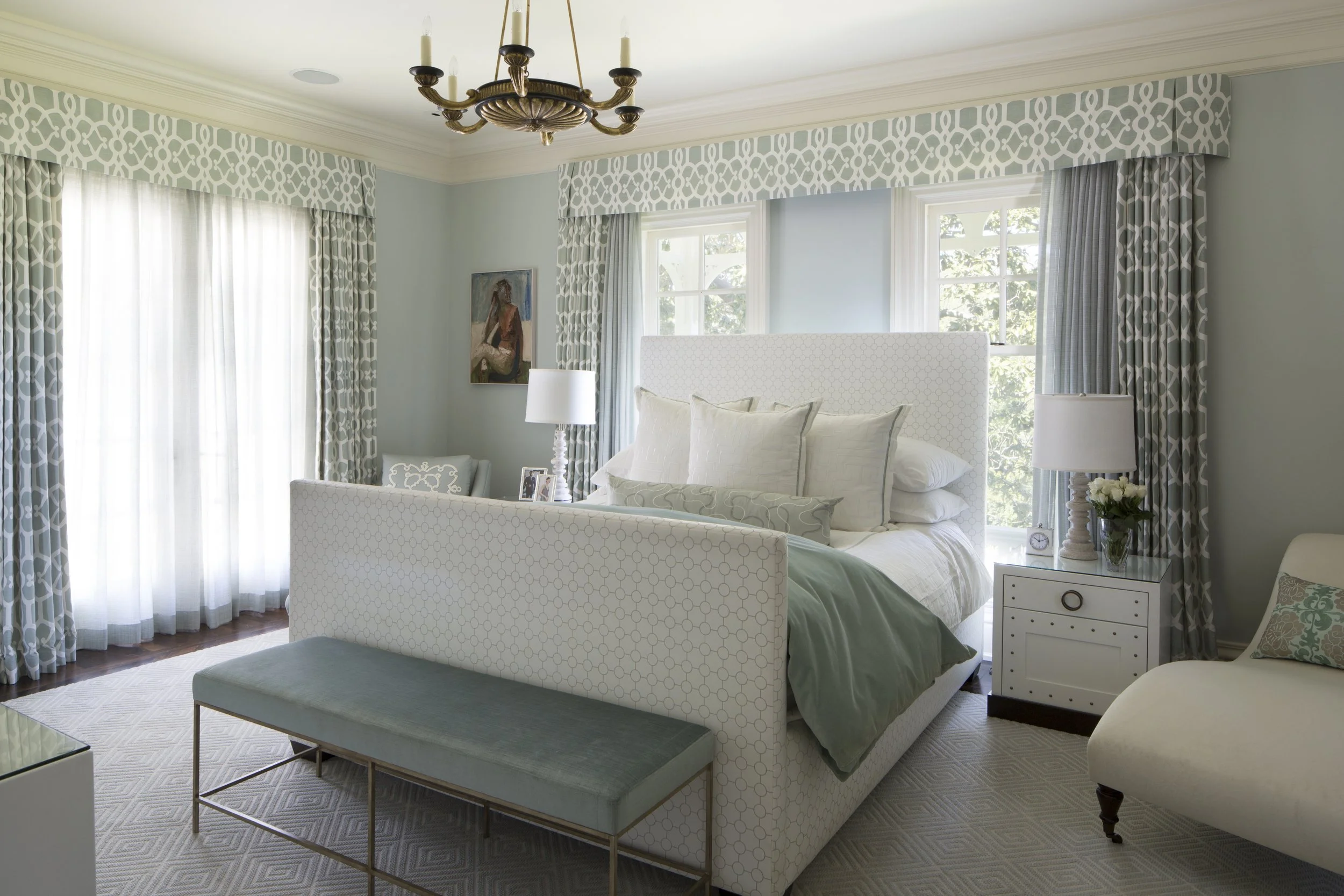 Moments of contrast and character are introduced with intention. Custom cabinetry, sculptural lighting, and curated art selections provide visual punctuation without disrupting the home’s timeless narrative. In the bedrooms, serenity and comfort take precedence, expressed through gentle color stories, upholstered forms, and carefully balanced symmetry.